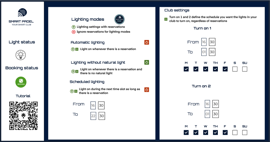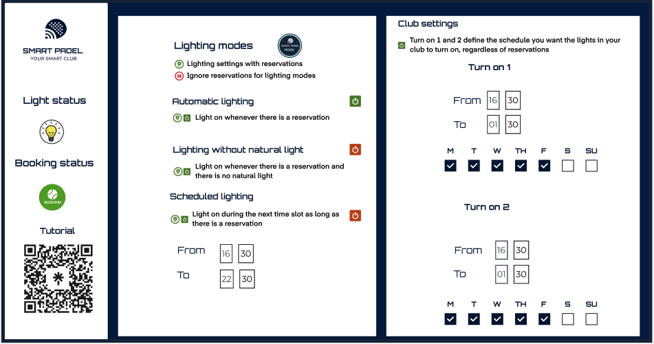El sistema de iluminación del Modo Smart Padel está integrado directamente con la plataforma de reservas, garantizando que las luces se activen automáticamente en función de las reservas y otras condiciones configuradas. Este modo evita cualquier anulación manual de la plataforma de reservas.