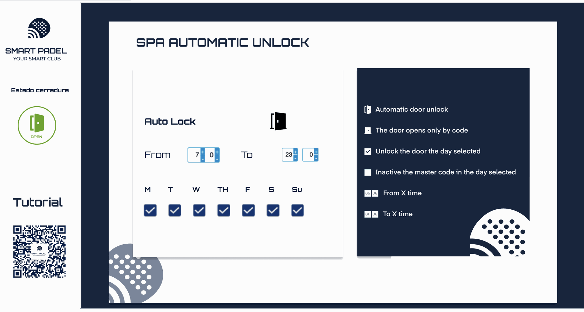El Desbloqueo Automático SPA es una solución diseñada para proporcionar un control completo y programado del acceso a instalaciones deportivas y áreas restringidas, garantizando una experiencia segura, práctica y flexible tanto para administradores como para usuarios.