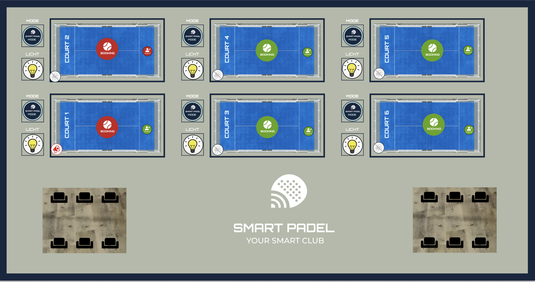 Funciona de forma similar a la iluminación de las pistas, pero con una opción adicional: puedes elegir si las luces de ambiente deben permanecer encendidas durante las reservas o no. Esto te permite adaptar la experiencia de iluminación según la atmósfera del club y tus preferencias de consumo energético.