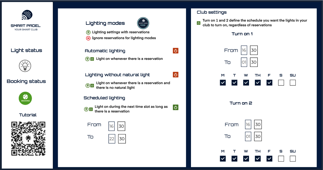 El sistema de iluminación del Modo Smart Padel está integrado directamente con la plataforma de reservas, garantizando que las luces se activen automáticamente en función de las reservas y otras condiciones configuradas. Este modo evita cualquier anulación manual de la plataforma de reservas.